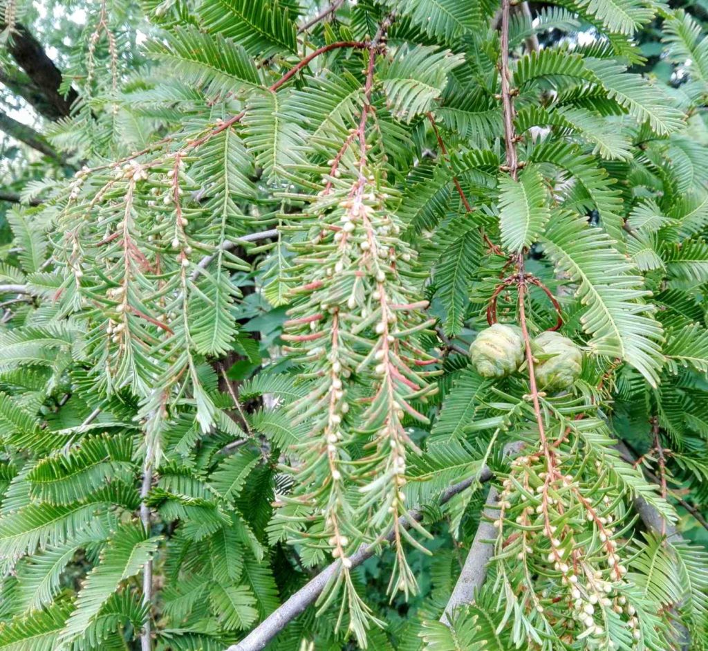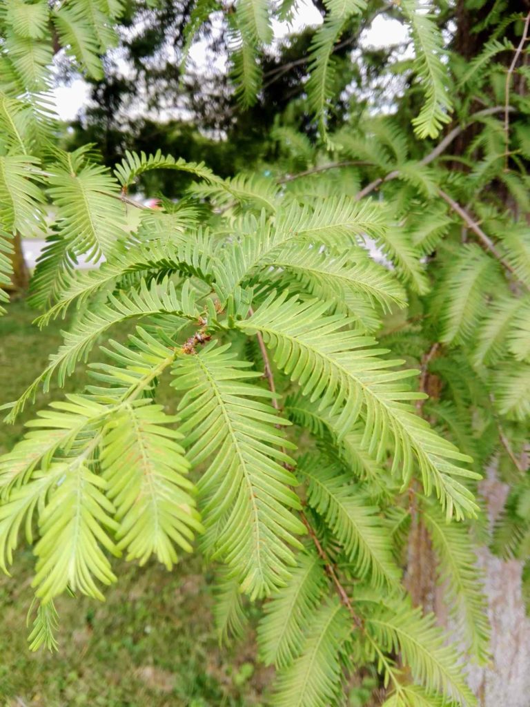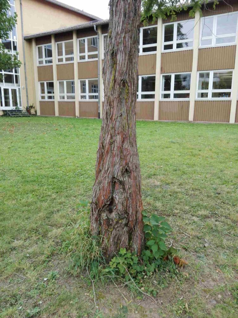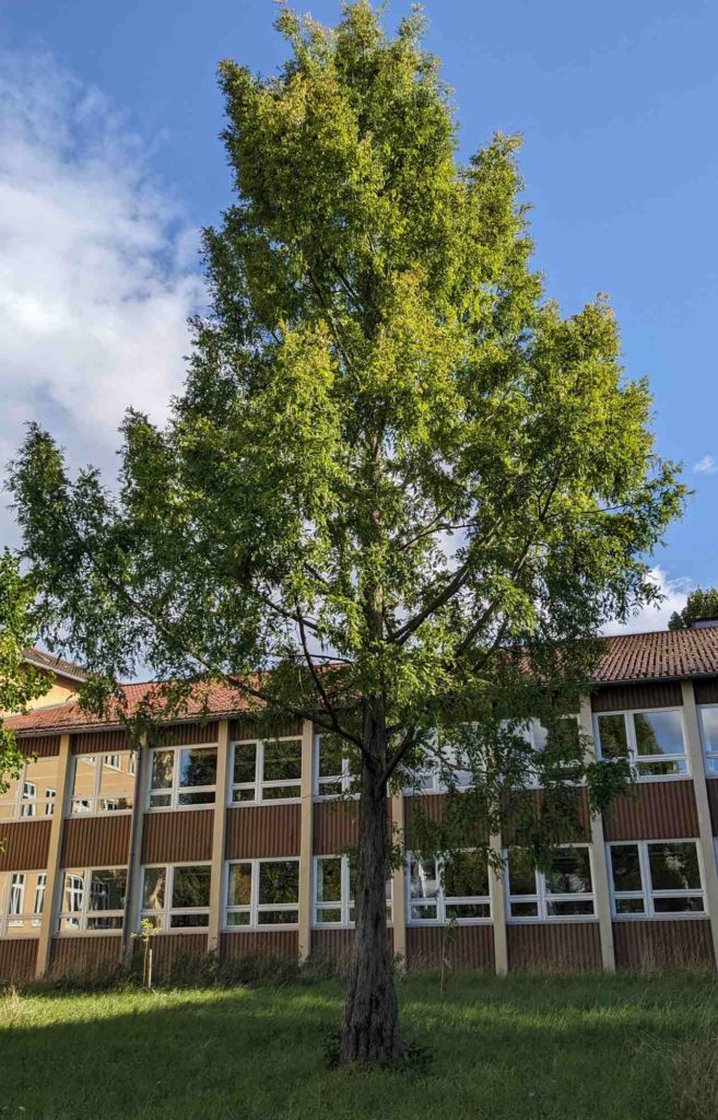 Aus der Kreidezeit in die Grünanlage – Urwelt-Mammutbaum am Bunsen-Gymnasium. Der wissenschaftliche Name lautet Metasequoia glytostroboides.
