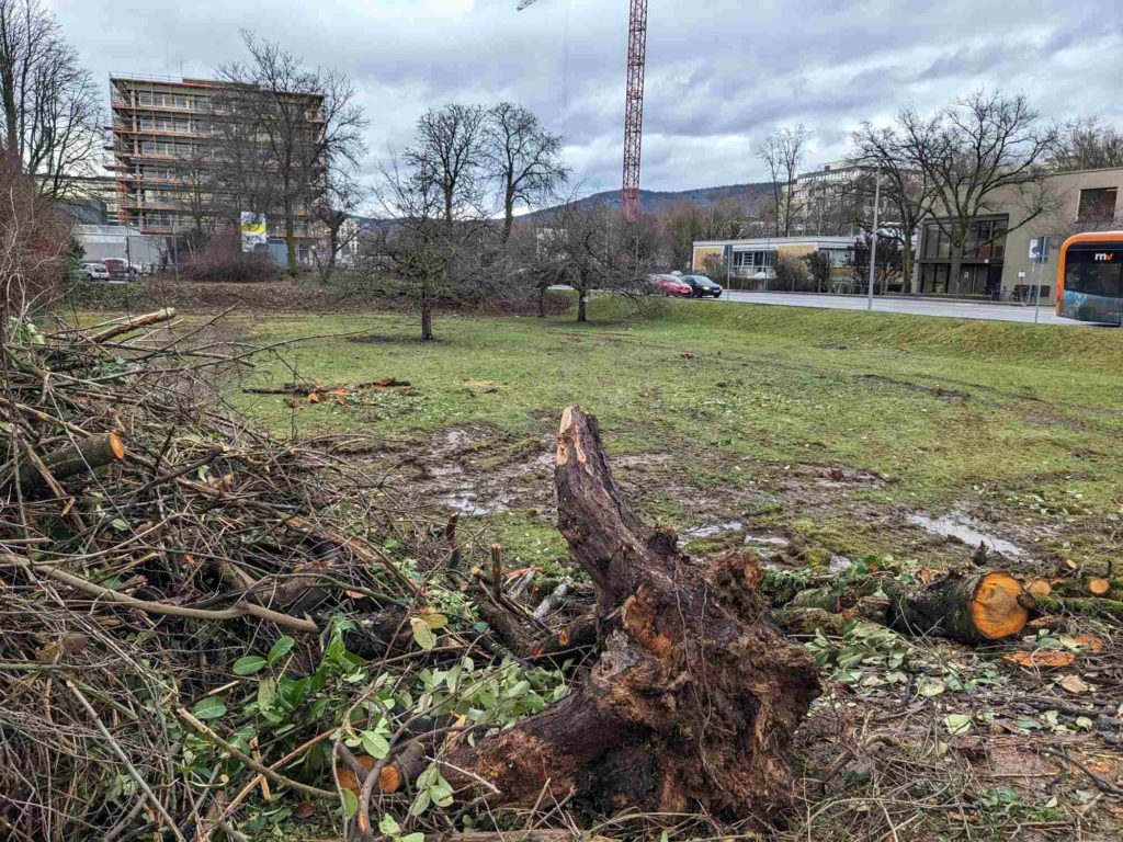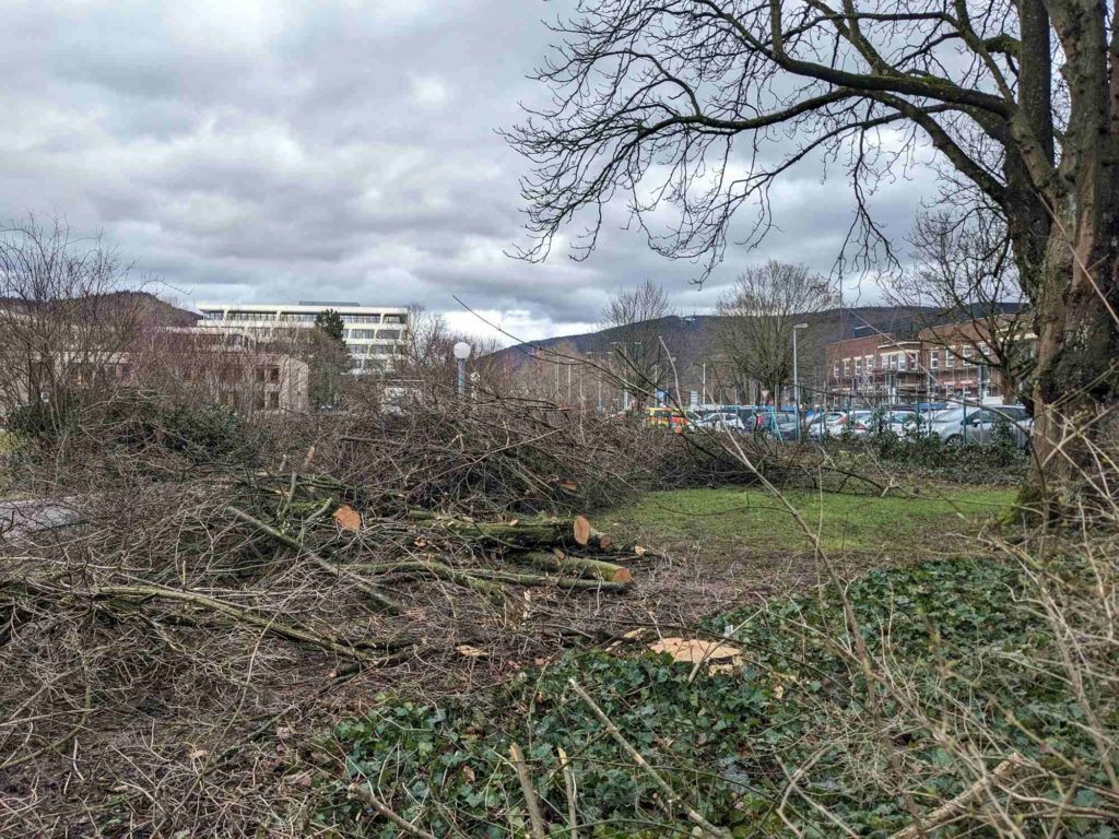 Auf dem Campus INF gab es bis vor wenigen Tagen eine kleine Streuobstwiese gegenüber dem Bauamt, direkt an der Bushaltestelle Kirschnerstraße. Nun wurden die Obstbäume gefällt und umgebende Hecken gerodet.