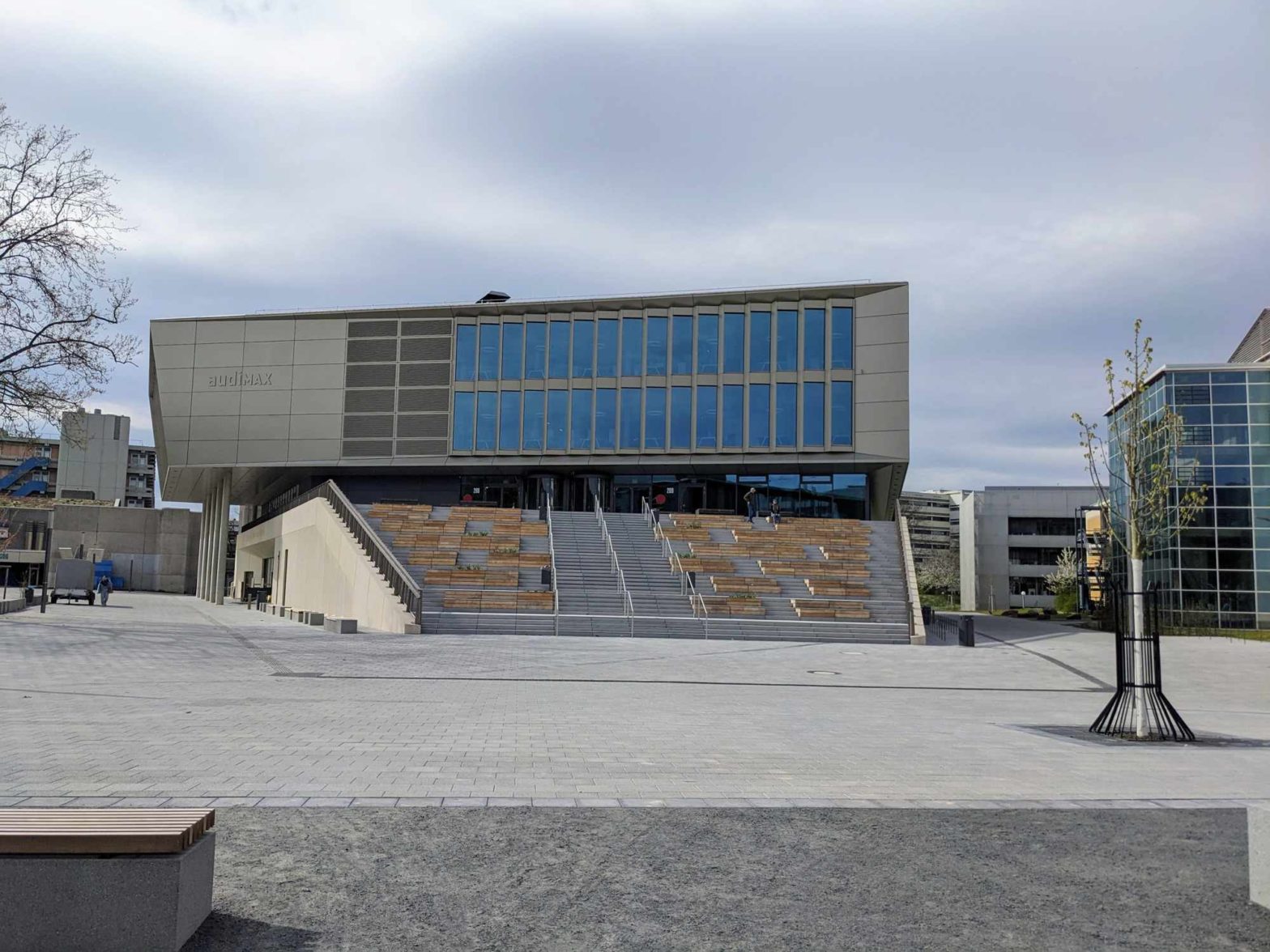 Das neue Audi-Max am Campus INF beeindruckt. Leider wurde im Außenbereich an der Begrünung gespart.